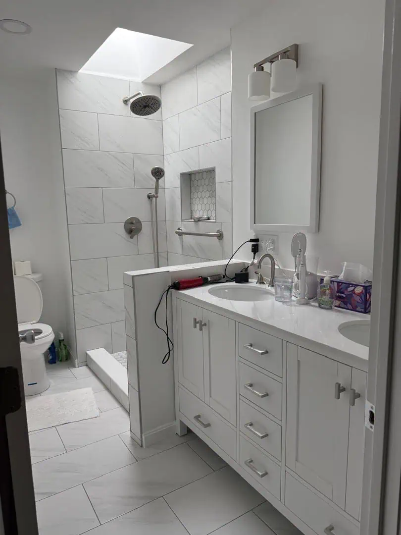 Wesley came to us wanting to transform his dark, outdated bathroom into a bright and comforting space—and we brought that vision to life. We opened up the layout to create a more spacious feel, installed crisp white tiles, a modern new vanity, and enhanced the overall atmosphere with a clean, cozy design. One of the most impactful upgrades was the skylight above the shower, which now projects natural light beautifully throughout the room, adding both warmth and dimension. What was once a dull, closed-off space is now a light-filled, serene bathroom that Wesley was truly pleased with.