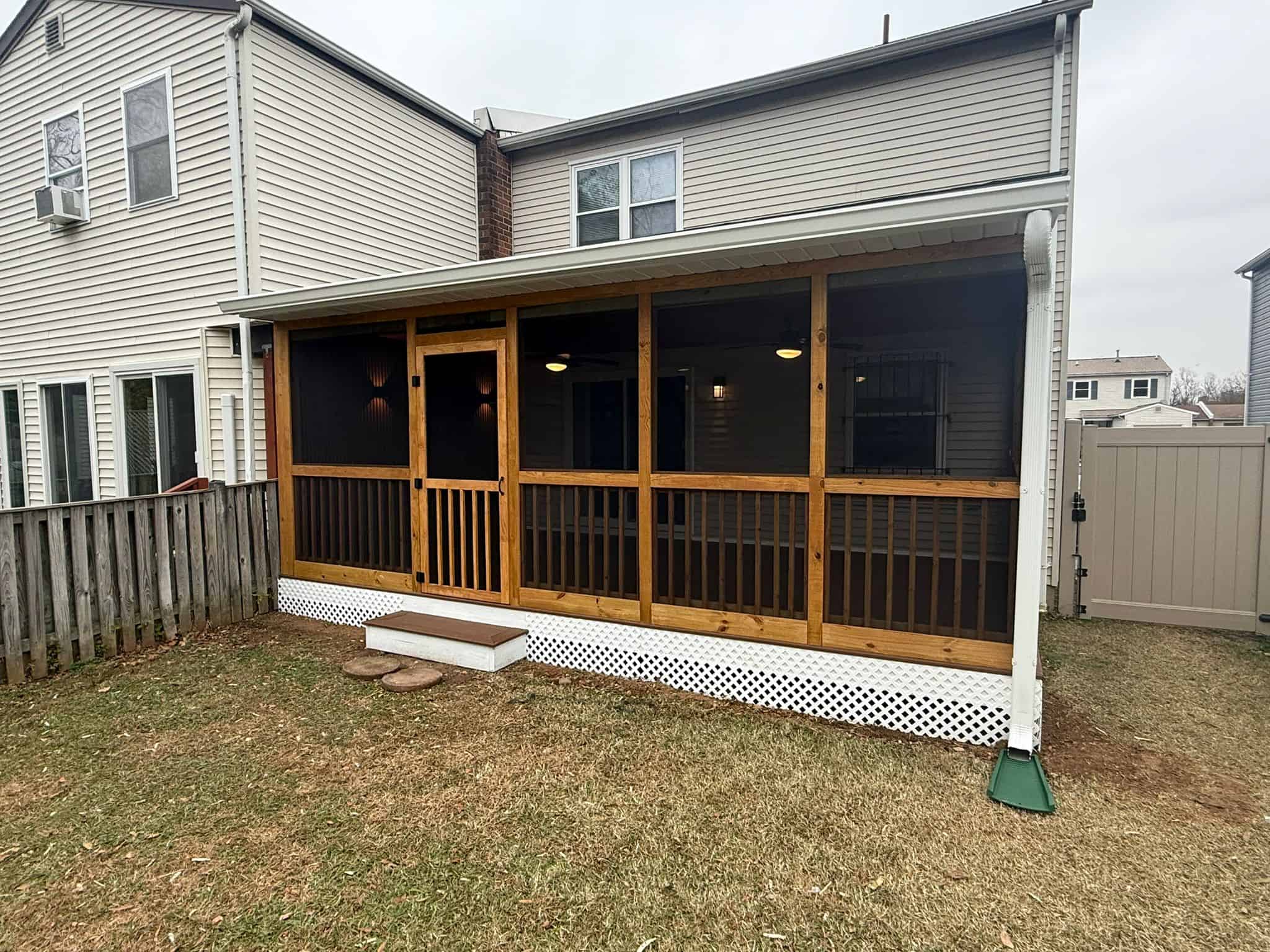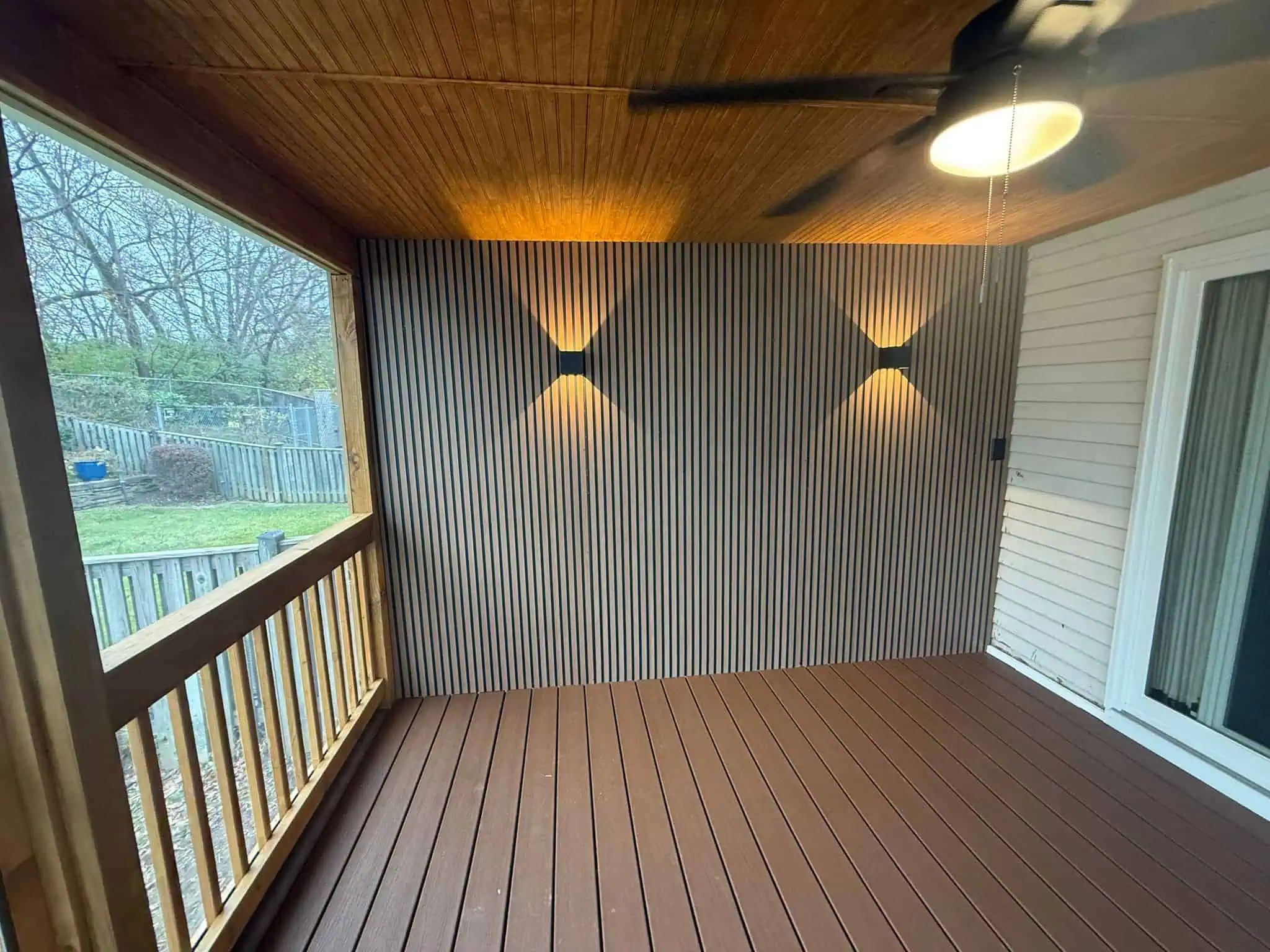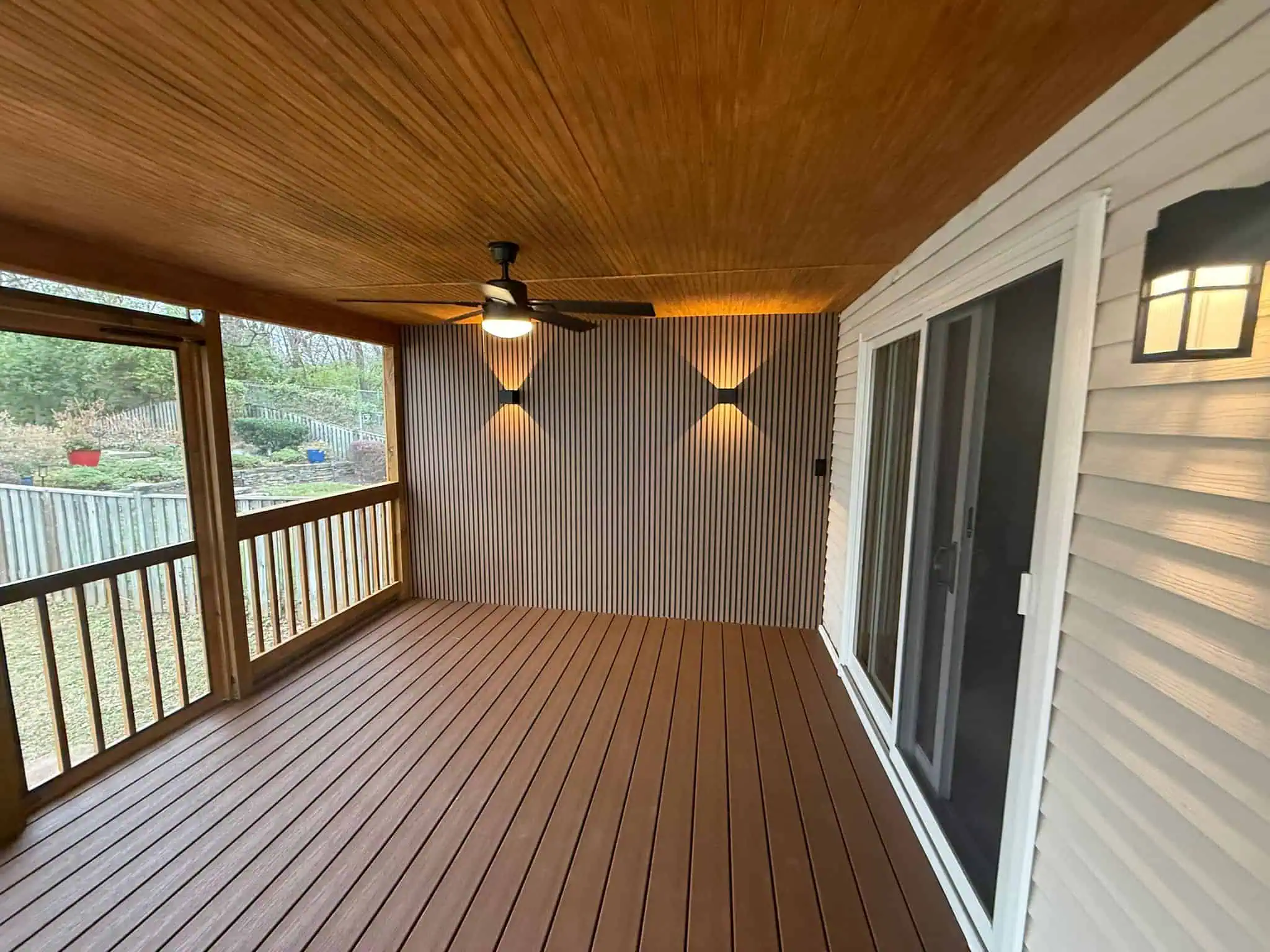 Their original deck was completely removed and rebuilt from the ground up. The new structure features a modern architectural design with neutral-toned composite flooring, a beautifully crafted roof system, recessed lighting, and a fully enclosed, high-visibility screen system. A ceiling fan provides airflow during the warmer months, while the insulated enclosure keeps the space comfortable in the winter. The screen assembly was designed to offer uninterrupted views of their garden while keeping insects out.