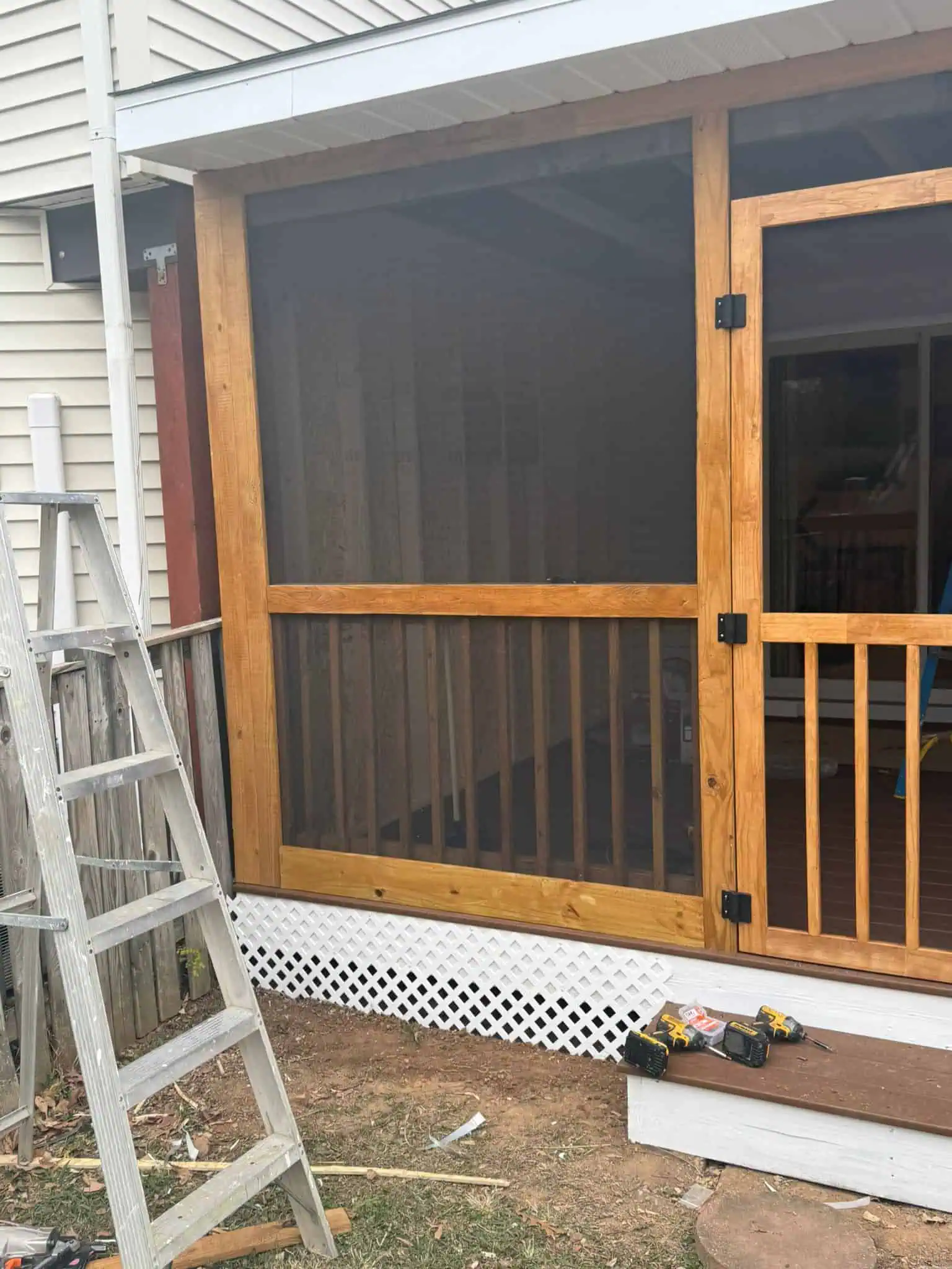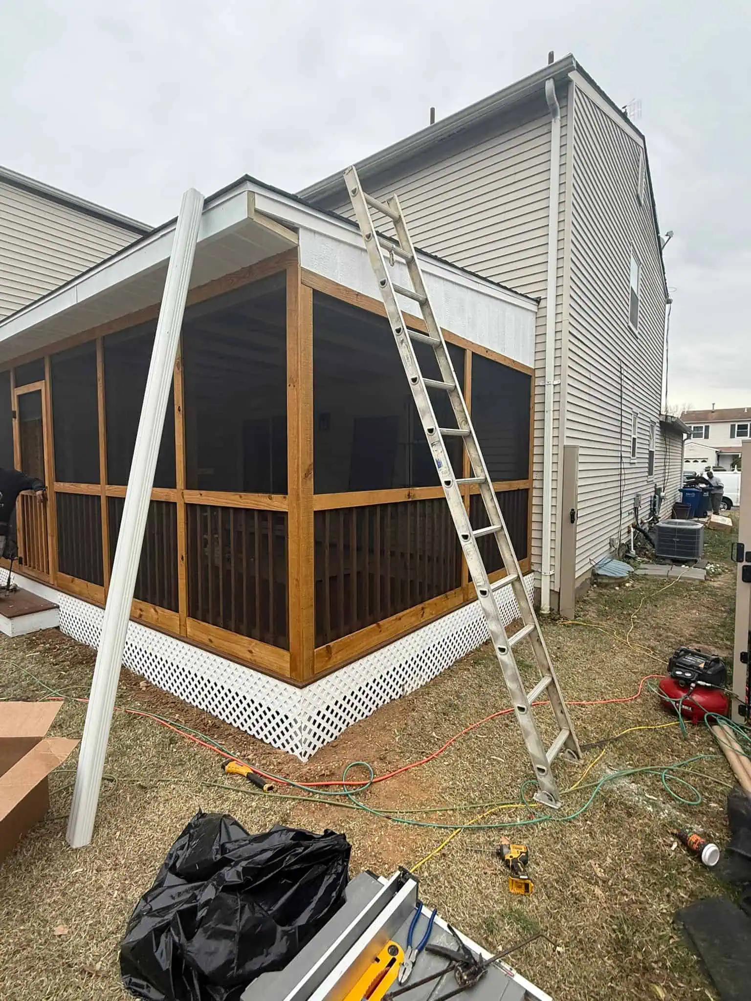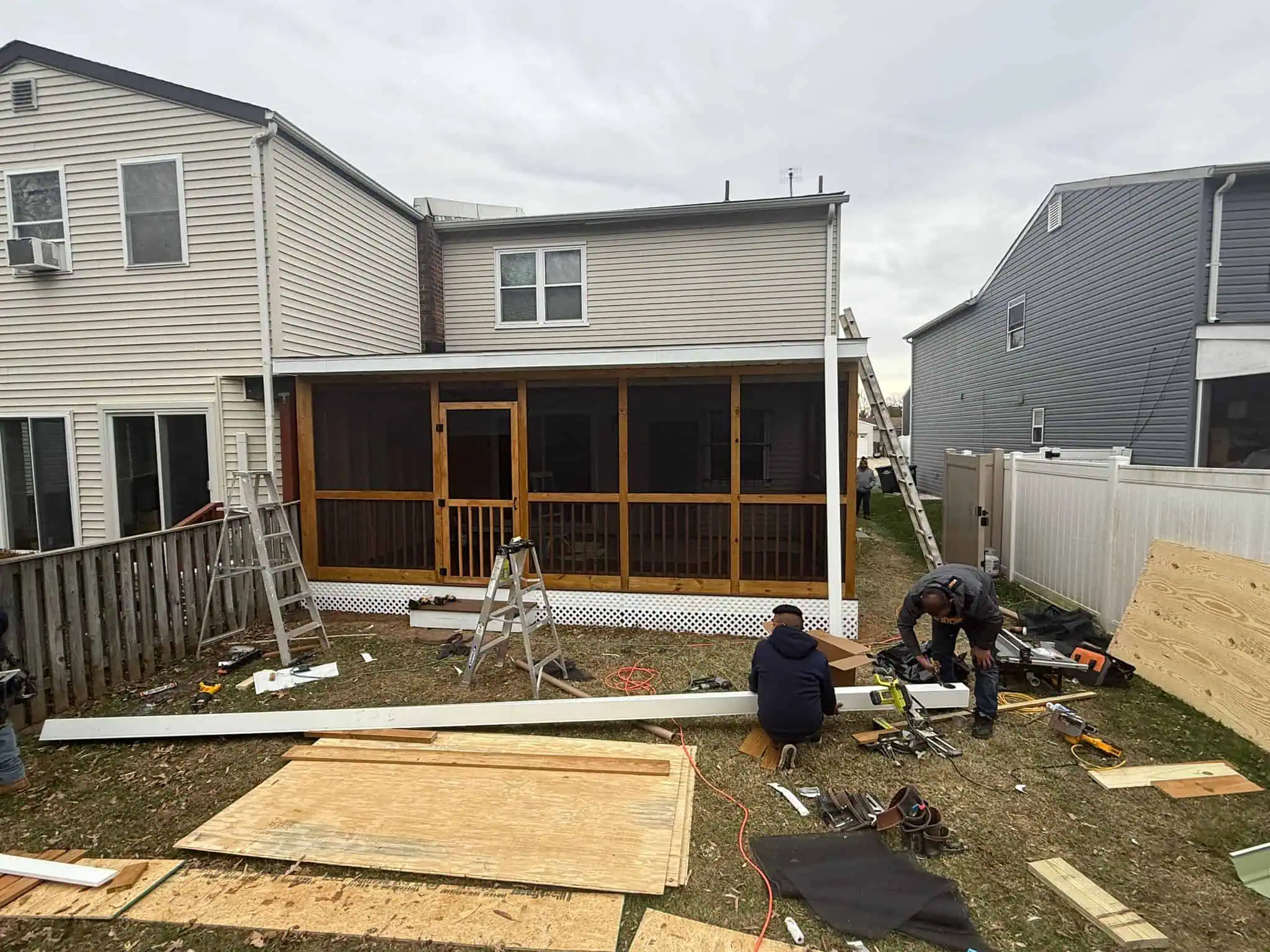 Their original deck was completely removed and rebuilt from the ground up. The new structure features a modern architectural design with neutral-toned composite flooring, a beautifully crafted roof system, recessed lighting, and a fully enclosed, high-visibility screen system. A ceiling fan provides airflow during the warmer months, while the insulated enclosure keeps the space comfortable in the winter. The screen assembly was designed to offer uninterrupted views of their garden while keeping insects out.
